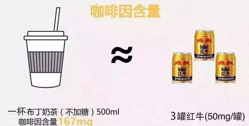 喝完奶茶的你,有沒有覺得會失眠、心慌?沒錯(cuò),你常喝的這些奶茶中,很多咖啡因都超標(biāo)!奶茶作為茶飲的一種,以茶作為原料,即使是傳統(tǒng)奶茶也會含有咖啡因,含量則取決于茶葉的多少。奶精調(diào)制的奶茶也會加入茶葉提取物或茶粉,沖泡后溶于水中的咖啡因更多。有時(shí)商家為了給奶茶提味,還會加入咖啡粉,也會增加咖啡因的含量。調(diào)查發(fā)現(xiàn),一杯奶茶中的最高的奶茶一杯竟有428mg咖啡因,相當(dāng)于4杯咖啡或8罐紅牛,已超出推薦的咖啡因每日攝入量400mg。飲料,最健康的還是那杯白開水!