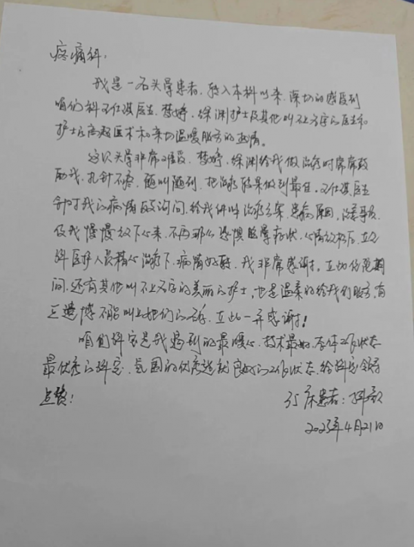 “感謝科室專家超高的醫(yī)術(shù)和親切溫暖的服務(wù),讓我的頭暈癥得到有效的治療!”家住醫(yī)院附近的韓女士對疼痛科醫(yī)護(hù)人員的精心治療表達(dá)真摯的感謝。