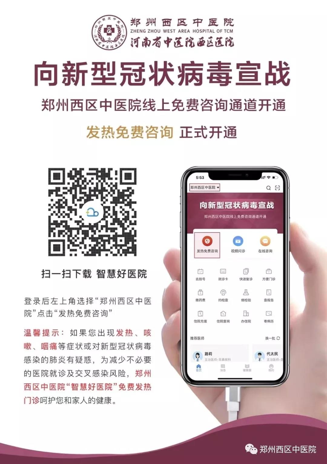 為了最大限度減少因人員聚集引發(fā)的交叉感染,保護(hù)廣大人民群眾的生命健康,有發(fā)熱或疑似發(fā)熱的患者朋友們推薦使用智慧好醫(yī)院App進(jìn)行免費(fèi)線上咨詢,鄭州西區(qū)中醫(yī)院全體醫(yī)護(hù)人員在特殊期間繼續(xù)為您的健康保駕護(hù)航!
