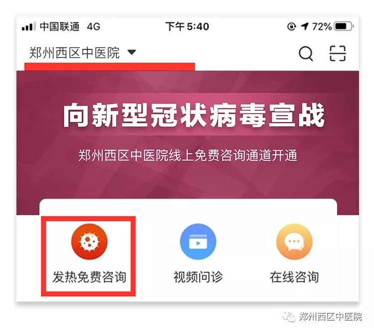 登錄后,左上角選擇“ 鄭州西區(qū)中醫(yī)院”并點(diǎn)擊“發(fā)熱免費(fèi)咨詢通道”開始申請。
