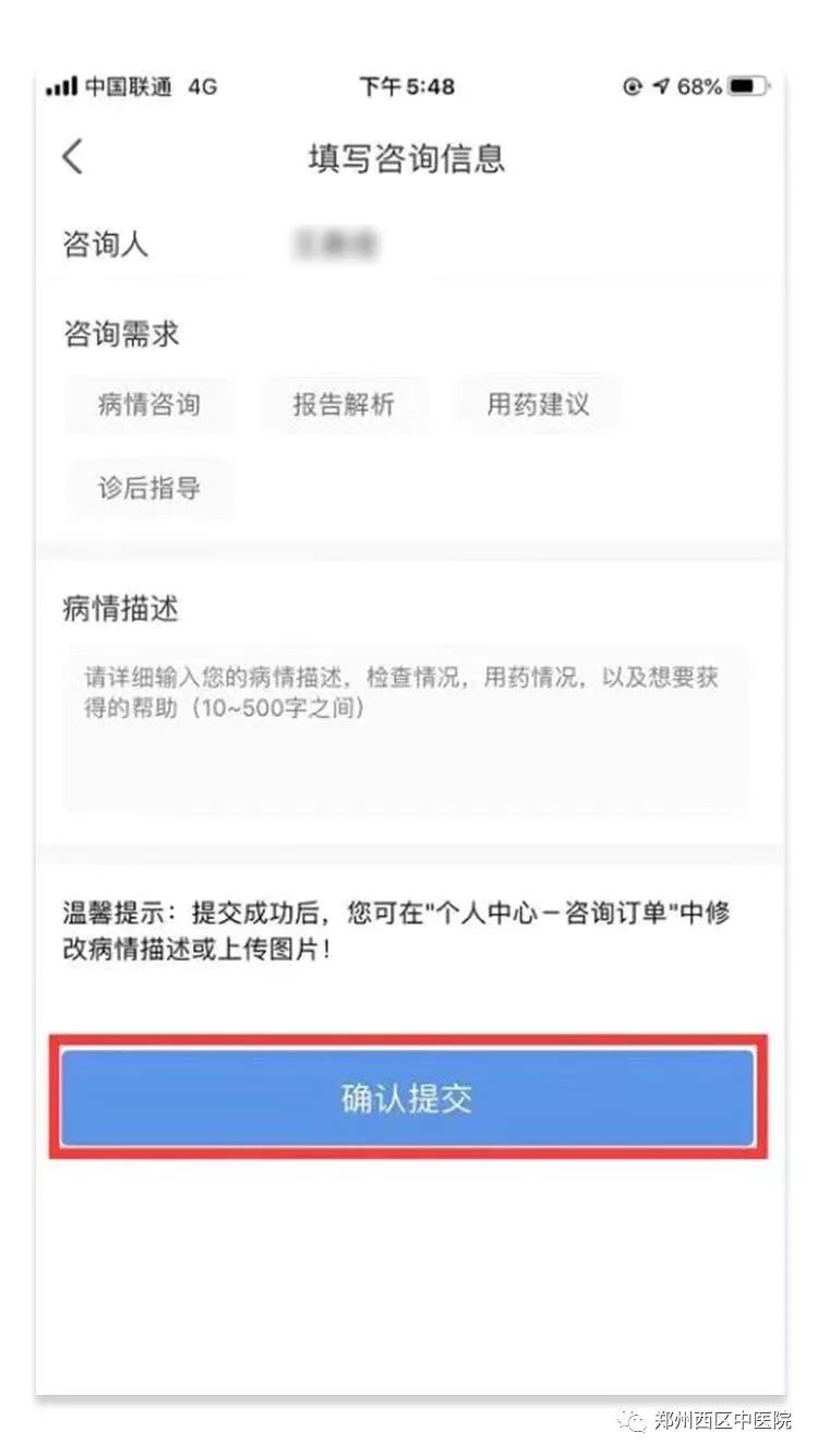 選擇科室,填寫病情信息后點(diǎn)擊“確認(rèn)提交”即可成功申請當(dāng)醫(yī)生接診后會有短信提醒。