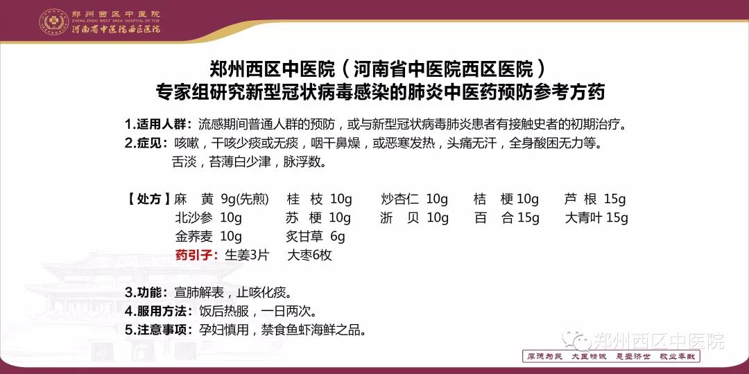 當(dāng)天,鄭州西區(qū)中醫(yī)院(河南省中醫(yī)院西區(qū)醫(yī)院)院長(zhǎng)王永漢聯(lián)系到鄭報(bào)全媒體記者,王院長(zhǎng)表示,醫(yī)院希望通過(guò)鄭報(bào)融媒公布出我們醫(yī)院專(zhuān)家組擬定的新型冠狀病毒感染的肺炎中醫(yī)藥預(yù)防參考方藥——《高新預(yù)防一號(hào)》藥方,讓更多的民眾都能喝到預(yù)防新型冠狀病毒的重要方劑,廣大市民可以在醫(yī)師指導(dǎo)下參考使用。方藥如下: