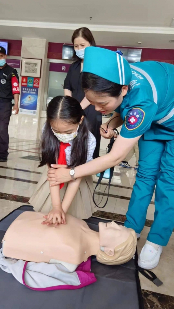 急診科護(hù)士長王亞娟和醫(yī)生杜亞濤通過心肺復(fù)蘇、兒童海姆立克急救法現(xiàn)場(chǎng)演示,讓同學(xué)們了解在什么情況下進(jìn)行心肺復(fù)蘇術(shù)以及氣道異物解除法(兒童海姆立克急救法)的操作流程及要點(diǎn),急診科醫(yī)生喻長春及護(hù)士種昆配合演示了成人海姆立克急救法操作步驟,同學(xué)們認(rèn)真聽講,認(rèn)真感受,深刻體會(huì)這系列搶救措施在搶救生命垂危的患者時(shí)的重要作用。