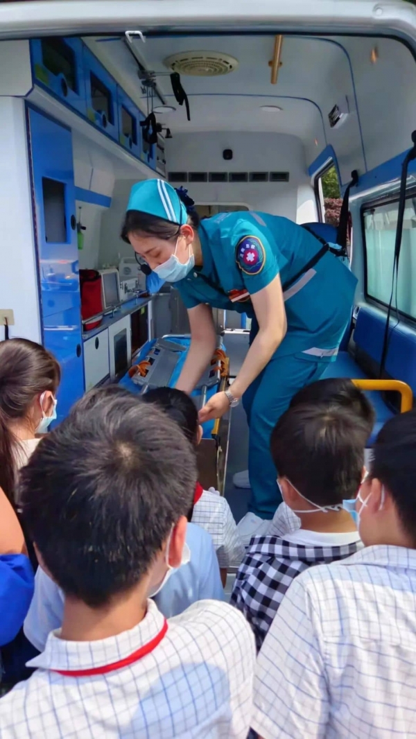 “經(jīng)??吹骄茸o(hù)車,但從來沒有見過里面是什么樣,真的好想看一看,老師帶我們?nèi)タ淳茸o(hù)車吧!”在同學(xué)們急迫請(qǐng)求下,王亞娟護(hù)士長帶領(lǐng)大家走進(jìn)救護(hù)車,詳細(xì)介紹了救護(hù)車的基本情況、配備的急救設(shè)備以及其功能作用。