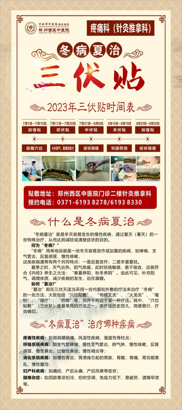 一年中最關(guān)鍵的“冬病夏治”時(shí)節(jié)即將到來,鄭州西區(qū)中醫(yī)院疼痛科也為大家準(zhǔn)備了三伏天福利, 預(yù)定三伏貼可享200元5次惠民價(jià)格。