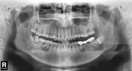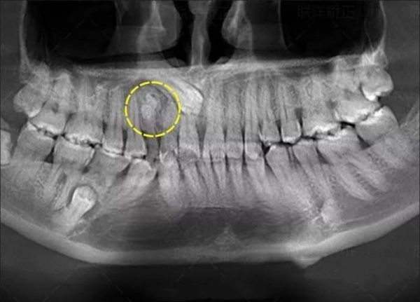 患者是30多歲的年輕男子,紅色標(biāo)記那顆牙松動,要求拔牙,開始嫌麻煩不愿拍片,后來經(jīng)過再三勸說還是拍了片。結(jié)果把所有人包括他自己都嚇了一跳。估計是良性,具體還得去醫(yī)院住院手術(shù)做病理檢查,所以大家不要忽視一張片子帶來輔助檢查的重要性。