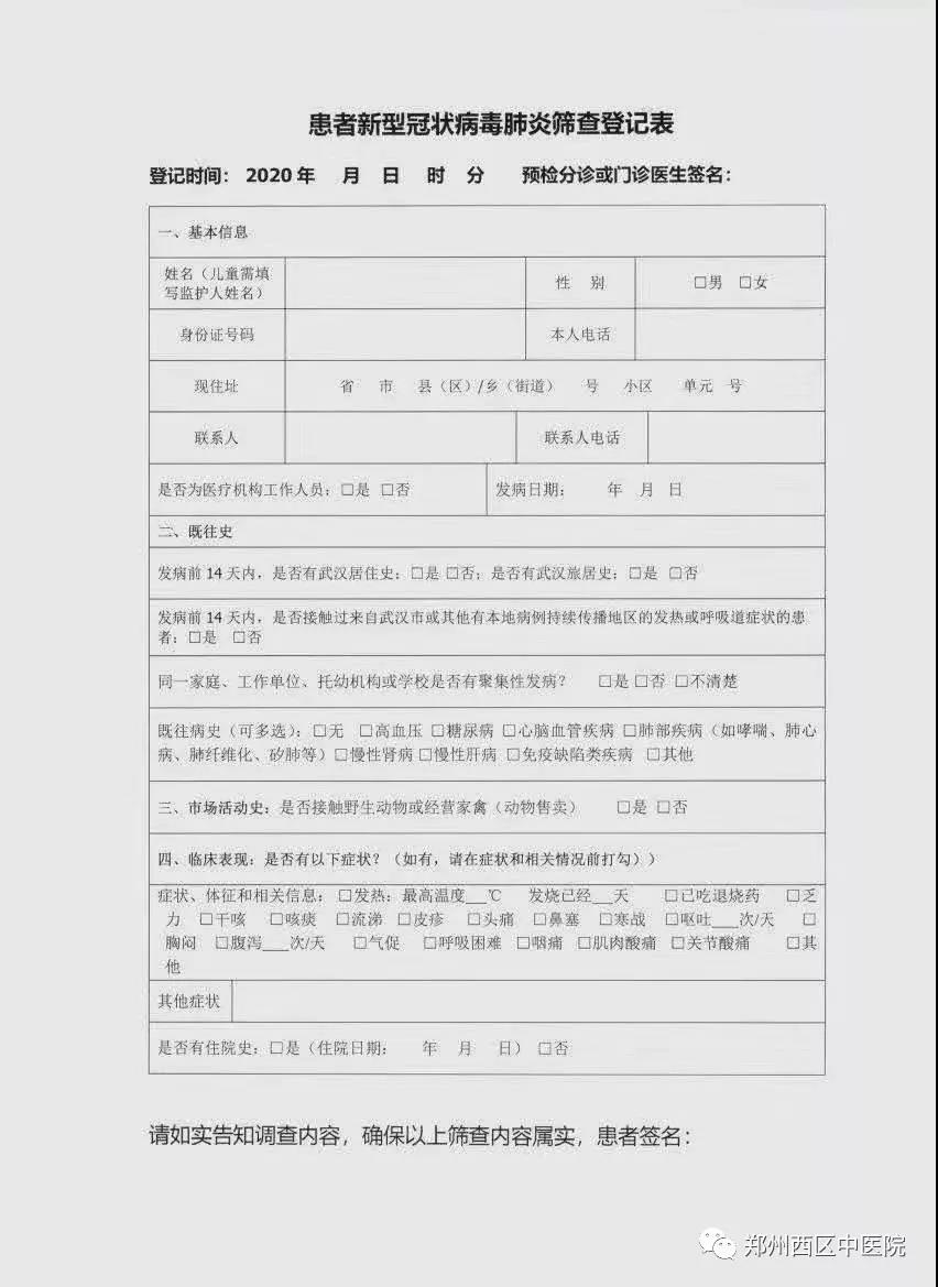 8.患者請(qǐng)配合醫(yī)務(wù)人員填寫(xiě)《患者新型冠狀病毒肺炎篩查登記表》。