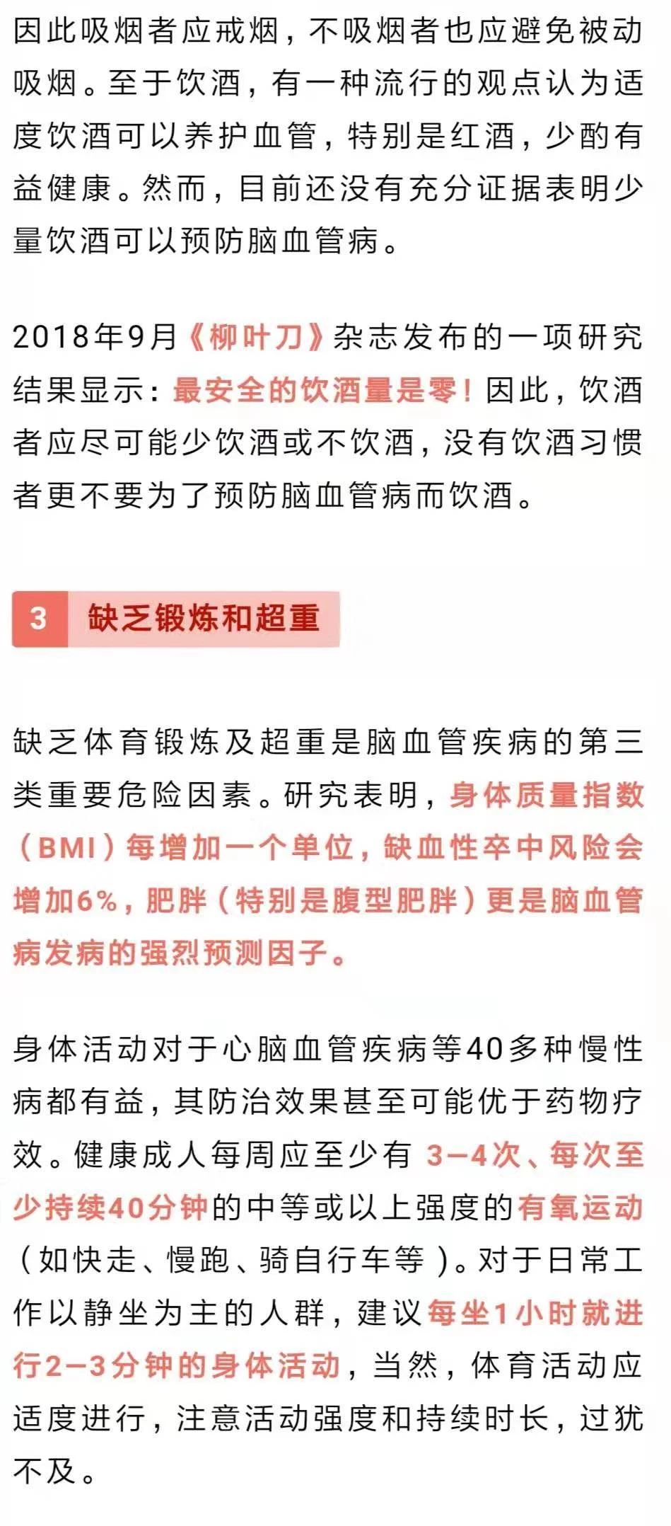 吸煙和飲酒是腦血管病的第二類(lèi)重要危險(xiǎn)因素。吸煙可使缺血性卒中的風(fēng)險(xiǎn)增加90%,使蛛網(wǎng)膜下腔出血的風(fēng)險(xiǎn)增加近2倍。被動(dòng)吸煙同樣會(huì)增加腦血管病的風(fēng)險(xiǎn)。此外,過(guò)量飲酒也會(huì)大大增加腦血管病風(fēng)險(xiǎn)。