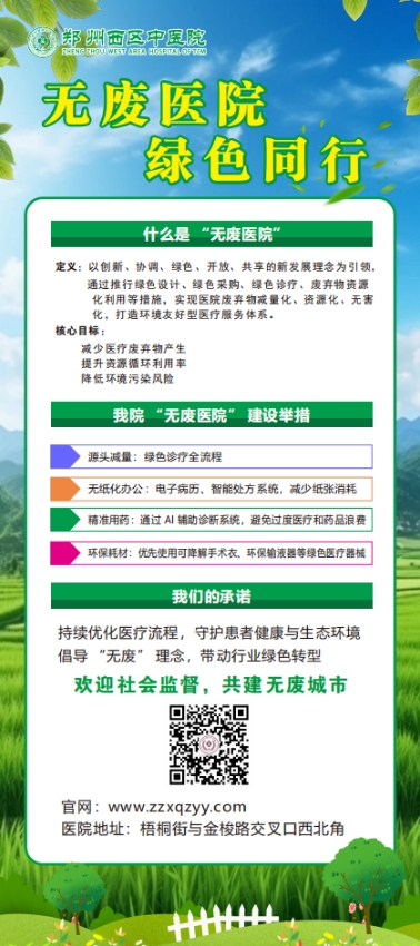 629 瀏覽為積極響應(yīng)國家生態(tài)文明建設(shè)號召,踐行綠色發(fā)展理念,鄭州西區(qū)中醫(yī)院近日全面啟動“無廢醫(yī)院”創(chuàng)建工作,通過優(yōu)化資源利用、強(qiáng)化垃圾分類、推廣數(shù)字化醫(yī)療等舉措,打造環(huán)境友好型醫(yī)療示范單位,為患者提供更潔凈、更可持續(xù)的健康服務(wù)。