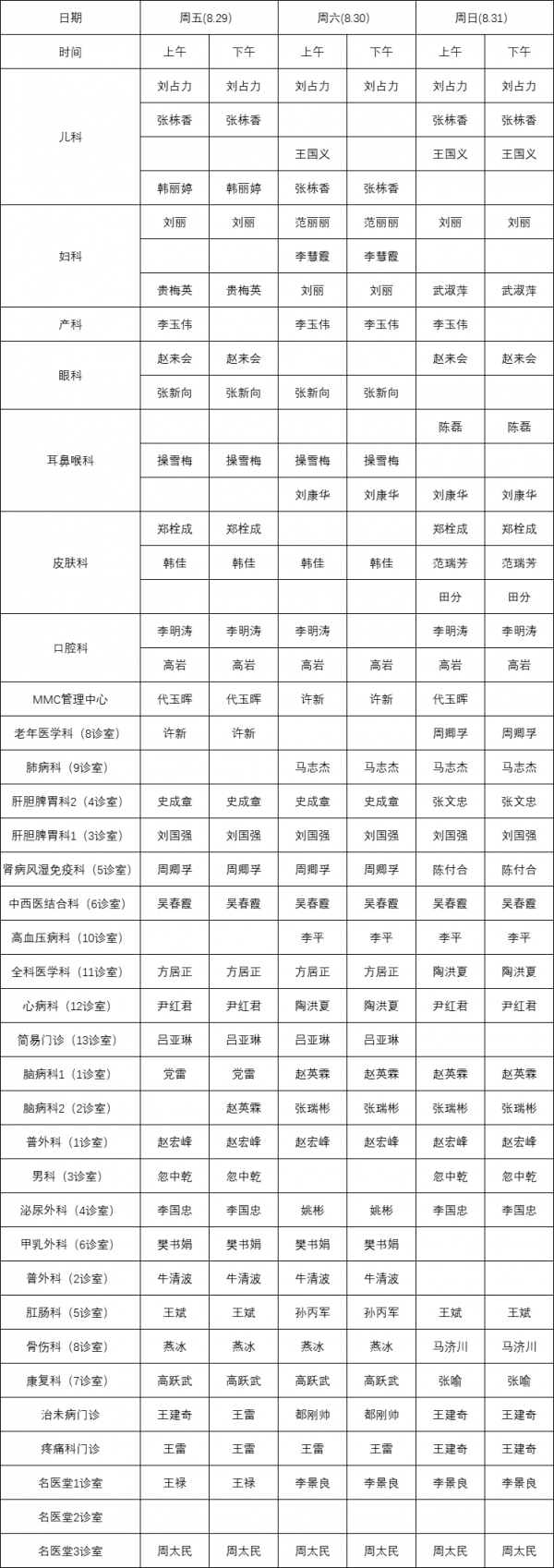 2025.8.25-8.31門(mén)診專(zhuān)家坐診表