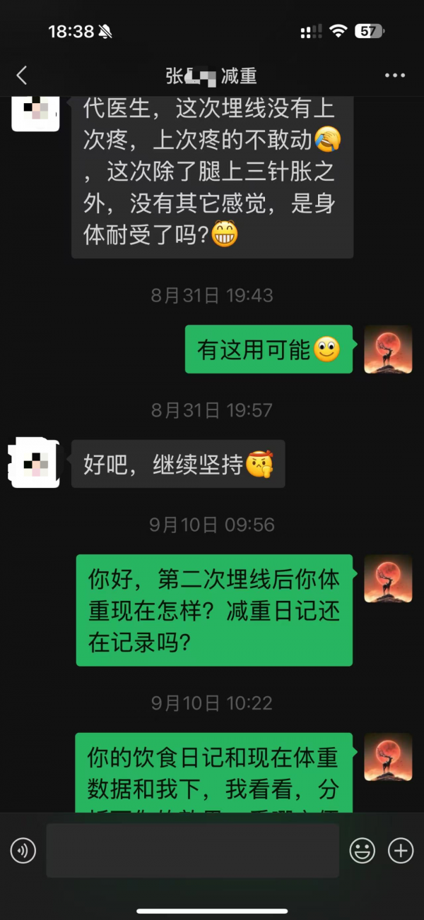 8月31日,張女士進行了第二次埋線。她反饋:“這次沒有上次疼,除了腿上三針有點感覺之外,沒有其它不適,是身體耐受了嗎?”