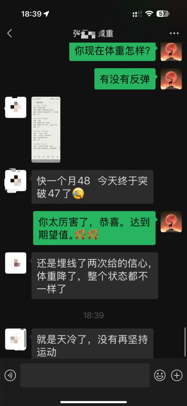“快一個月48,今天終于突破47了!”張女士在最近一次溝通中欣喜地分享。從8月到10月,她累計減重近9公斤,不僅達到了理想體重,整個人的精神狀態(tài)、身體感受也煥然一新。