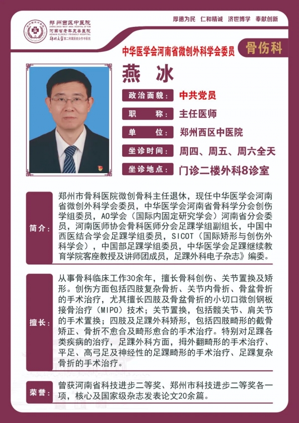 鄭州市骨科醫(yī)院微創(chuàng)骨科主任退休,現(xiàn)任中華醫(yī)學(xué)會(huì)河南省微創(chuàng)外科學(xué)會(huì)委員,中華醫(yī)學(xué)會(huì)河南省骨科學(xué)分會(huì)創(chuàng)傷學(xué)組委員,A0學(xué)會(huì)(國(guó)際內(nèi)固定研究學(xué)會(huì))河南省分會(huì)委員,河南醫(yī)師協(xié)會(huì)骨科醫(yī)師分會(huì)足踝學(xué)組副組長(zhǎng),中國(guó)中西醫(yī)結(jié)合學(xué)會(huì)足踝學(xué)組委員,SIC0T(國(guó)際矯形與創(chuàng)傷外科學(xué)會(huì)),中國(guó)部足踝學(xué)組委員,中華醫(yī)學(xué)會(huì)足踝繼續(xù)教育學(xué)院客座教授及講師團(tuán)成員,足踝外科電子雜志》編委。