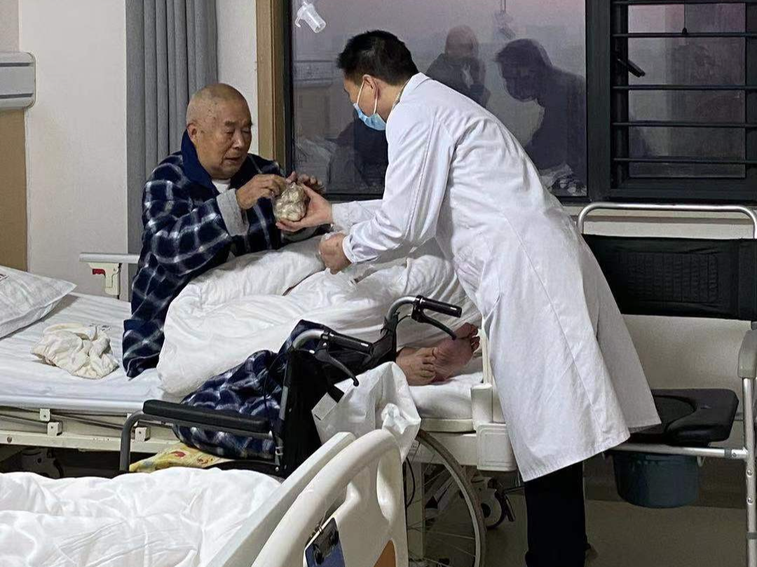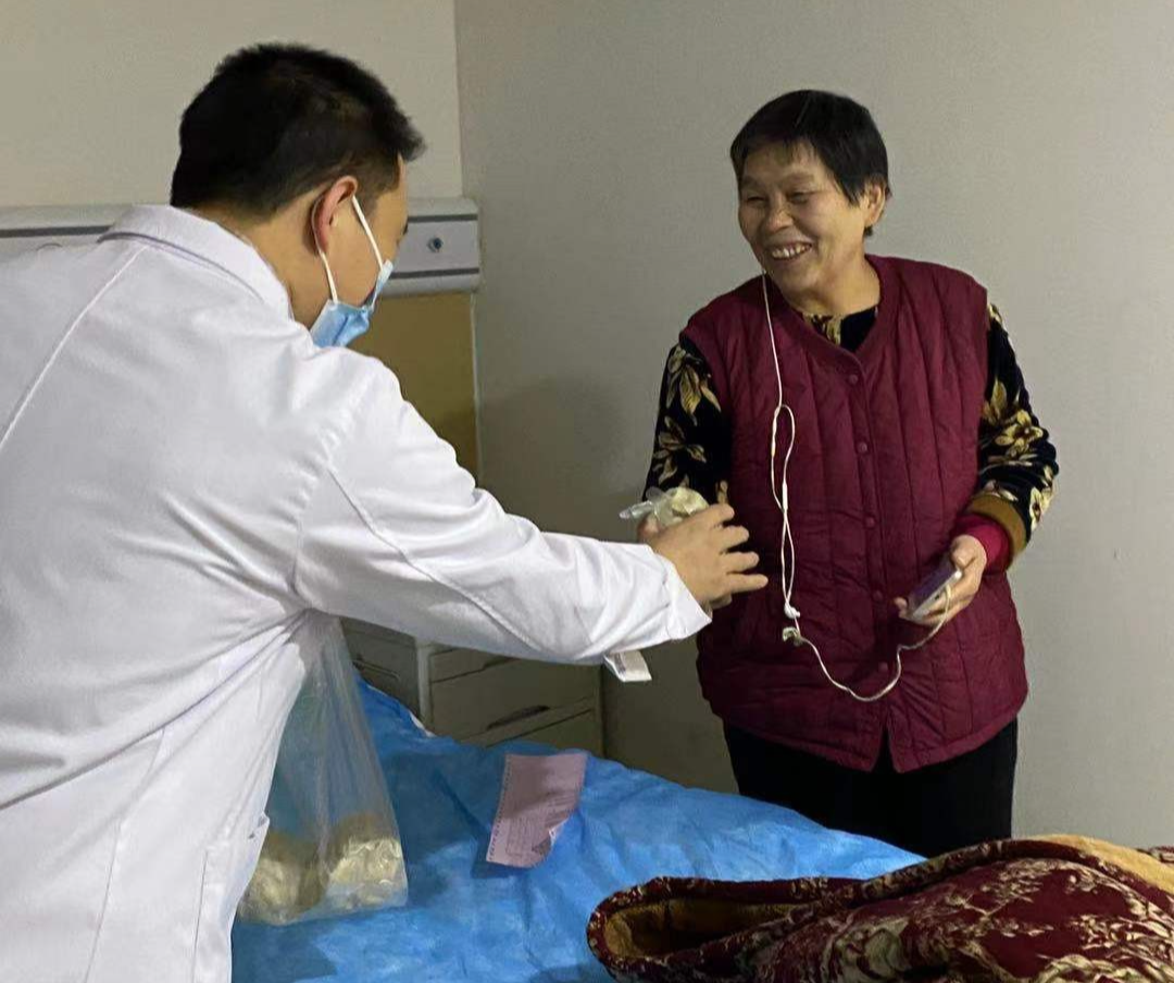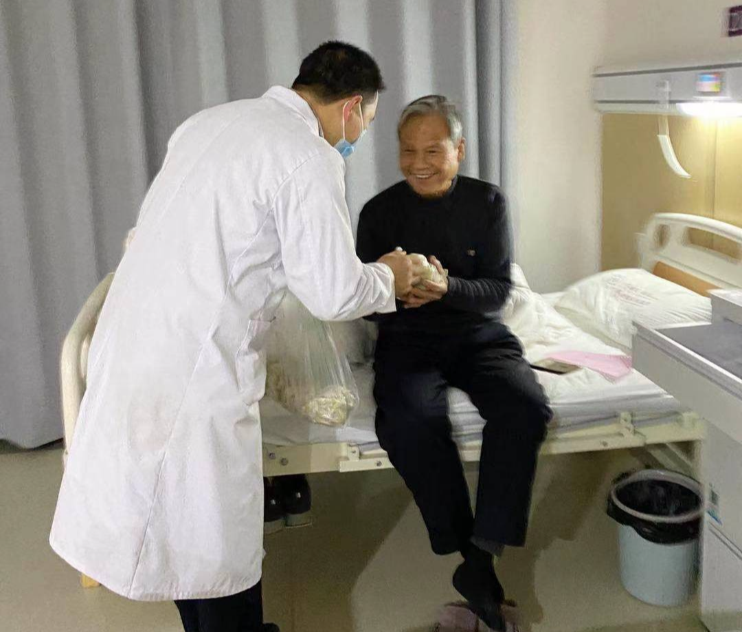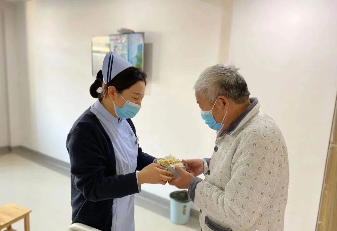 在大家的共同努力下,熱騰騰的餃子終于出鍋了,大家紛紛來“認(rèn)領(lǐng)”屬于自己的餃子。為了讓餃子吃得更加有滋有味,一位阿姨還特意精心準(zhǔn)備了餃子醋等蘸料,為了讓每一位住院病人都能吃上熱騰騰、香噴噴的餃子??浦魅畏莱杉白o(hù)士長馬蒙蒙親自把煮好的餃子送到他們的手中,并送上滿滿的祝福!