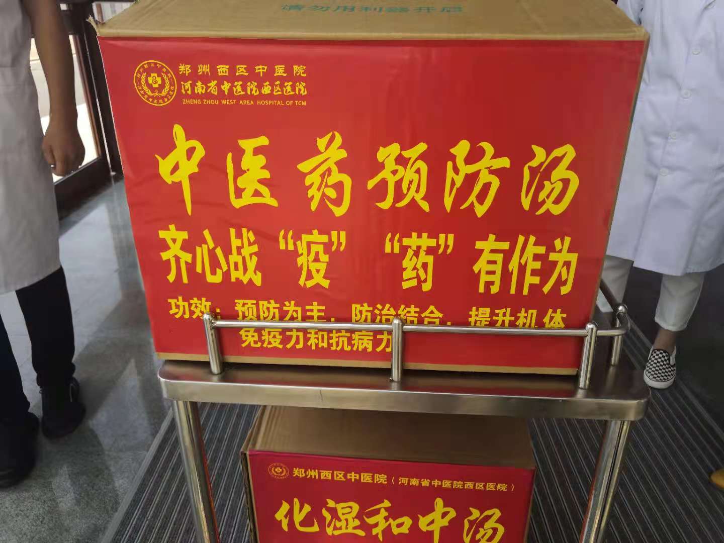 [中醫(yī)藥預(yù)防湯]是根據(jù)鄭州市疫情防控領(lǐng)導(dǎo)小組65號(hào)文件中推薦藥方(生黃芪10克,蒼術(shù)10克,白術(shù)10克,防風(fēng)6克,藿香10克,生薏仁15克,茯苓10克,金銀花15克,連翹10克,陳皮10克,貫眾10克),由我院藥劑科加班加點(diǎn)熬制而成,此湯劑以預(yù)防為主,防治結(jié)合,有提升機(jī)體免疫力及抗病力的功效。