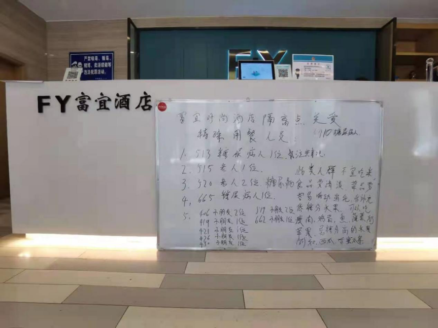 我跟隨醫(yī)院中醫(yī)巡診組走進了我們所管轄的七家酒店。到每一個隔離點時,首先映入眼簾的就是“鄭州高新區(qū)健康關(guān)愛中心?!笨粗P(guān)愛中心,我還以為走錯地方了,但是看到我們親切的同事,我知道就是這里,跟隨大家進到一樓大廳,有一個一覽表,讓我印象最深刻的是一塊大黑板上面標注著,A房間是糖尿病隔離人員,注意飲食搭配。B房間有小朋友,葷素搭配,合理膳食等,在這里隔離人群可以享受定制的餐食。我院藥劑科根據(jù)鄭州市新冠疫情防控領(lǐng)導(dǎo)小組辦公室65號文件中推薦的藥方,精心熬制而成湯劑。張文宗副院長詳細詢問每一個隔離人員用藥情況、注意事項,有沒有不良反應(yīng)等,針對特殊隔離人員最好做到一人一方。
