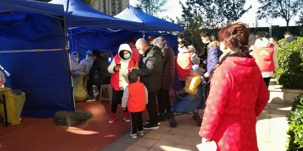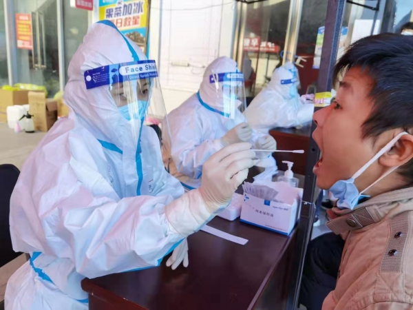 11月8日早8:00,醫(yī)療隊(duì)迅速投入工作,身穿厚重的防護(hù)服,在戶外頂著寒風(fēng),與病毒“零距離”接觸……”叔叔,張大嘴巴,說(shuō)啊......””寶貝,乖,不哭,讓阿姨看看嘴里有沒(méi)有小蟲(chóng)子?!薄鞍⒁?,不要緊張,嘴巴張開(kāi),說(shuō)啊......”在醫(yī)療隊(duì)員的引導(dǎo)下,大家間隔一米排隊(duì),全民采集核酸工作有序進(jìn)行。
