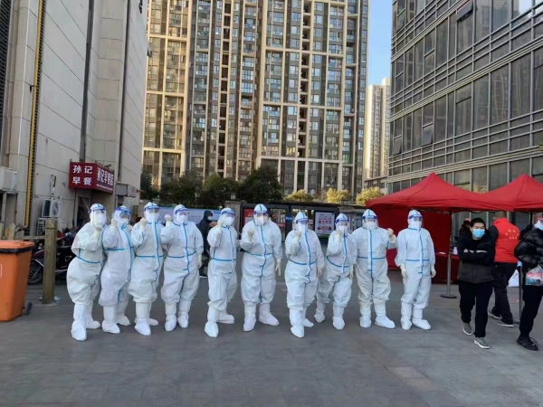 11月8日早上6點(diǎn)50分,天還未亮,被抽調(diào)人員已經(jīng)全部集結(jié)完畢,等待出發(fā)。送別現(xiàn)場(chǎng),醫(yī)務(wù)部主任曹輝、護(hù)理部主任馬冬菊、院感杜金金和大家交流“核酸采樣和防護(hù)等強(qiáng)化培訓(xùn)”注意事項(xiàng)?!按舜尾蓸硬捎每谘适米硬蓸?,大家一定切記采樣流程,做好自我防護(hù),確保采樣質(zhì)量和檢測(cè)質(zhì)量......”臨行前,院長(zhǎng)王永漢再三強(qiáng)調(diào)此次任務(wù)的重要性。隨后,150位醫(yī)療人員分成每組30人,在各組長(zhǎng)的帶領(lǐng)下,分赴高新區(qū)數(shù)碼港片區(qū)、華智片區(qū)、航天片區(qū),開(kāi)展全民新冠病毒核酸檢測(cè)。