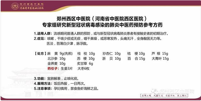 當天,鄭州西區(qū)中醫(yī)院(河南省中醫(yī)院西區(qū)醫(yī)院)院長王永漢表示,醫(yī)院希望通過媒體公布出我們醫(yī)院專家組擬定的新型冠狀病毒感染的肺炎中醫(yī)藥預(yù)防參考方藥——《高新預(yù)防一號》藥方,讓更多的民眾都能喝到預(yù)防新型冠狀病毒的重要方劑,廣大市民可以在醫(yī)師指導(dǎo)下參考使用。藥方如下: