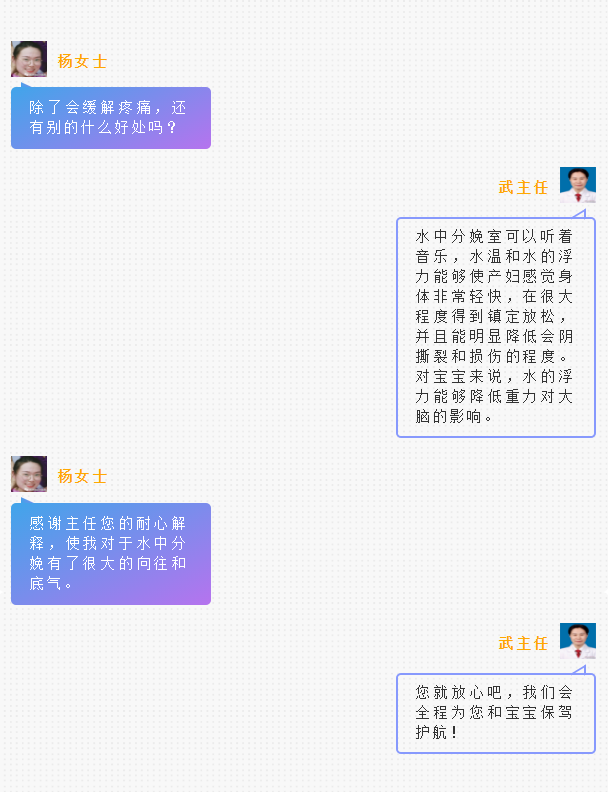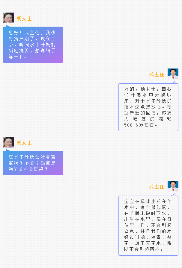 楊女士本身是一名醫(yī)務(wù)工作者,對于水中分娩,前期也做了一些功課,但鄰近預(yù)產(chǎn)期心里還是忐忑不安,便前來我院咨詢婦產(chǎn)科武淑萍主任。