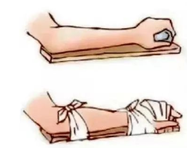 搬運(yùn)前進(jìn)行簡(jiǎn)單固定。木板、較硬的書本雜志固定患肢。